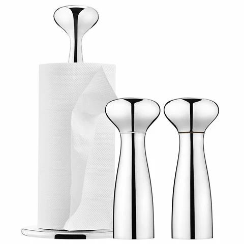 The Alfredo collection was designed by Alfredo Häberli with curved, smooth lines that suggest continuous movement. . Within this Alfredo set, you’ll find two kitchen essentials: a kitchen roll holder, and a pair of salt and pepper mills. Both glisten in polished stainless steel, for a uniform sense of style that flows from the kitchen to the dinner table.