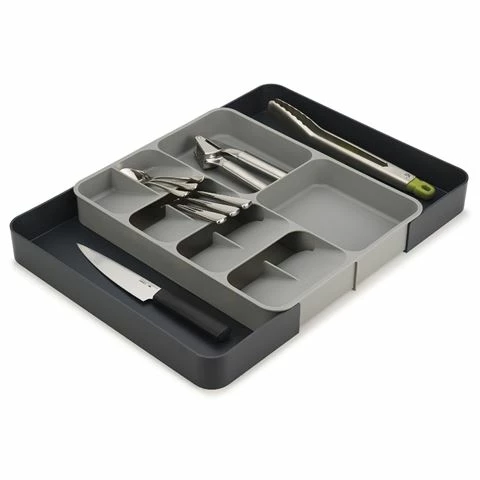 The unique design of this highly practical storage solution features five overlapping compartments for storing cutlery and two deep-sided compartments for holding gadgets so you can easily organize messy cutlery and utensil drawers.