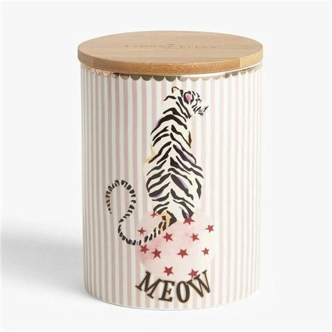 A fine china kitchen storage jar featuring a striped design and a Yvonne Ellen Tiger illustration. The bamboo lid fits neatly on the canister, making the Tiger Storage Jar airtight and suitable for storing dried foods, coffee, tea or sugar.